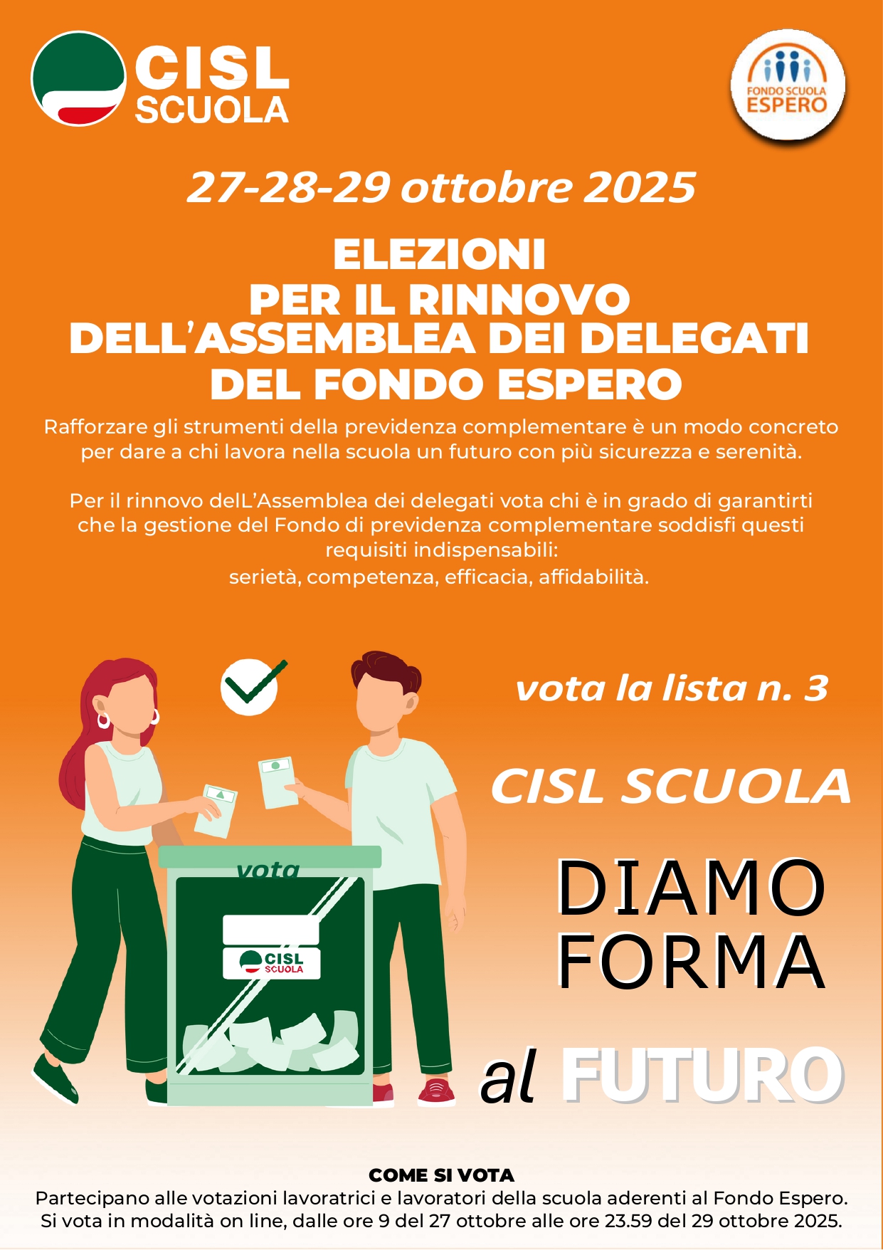 A partire dalle ore 9 del 27 ottobre e fino alle ore 23.59 del 29 ottobre 2025 si vota per eleggere i trenta componenti in rappresentanza delle lavoratrici e dei lavoratori nell'Assemblea dei Delegati del Fondo Espero, il fondo di previdenza complementare del personale scolastico. Altri trenta componenti fanno parte dell'Assemblea in quanto designati dai datori di lavoro (MIM e MEF, formazione professionale). Sarà compito dell'Assemblea eleggere il Consiglio di Amministrazione.